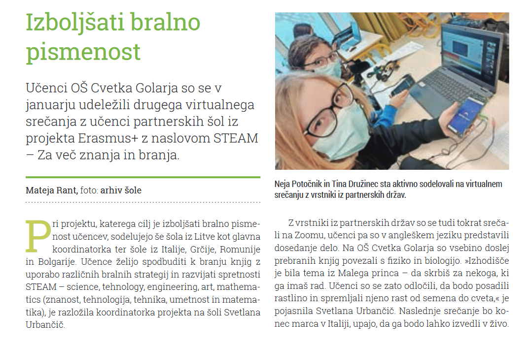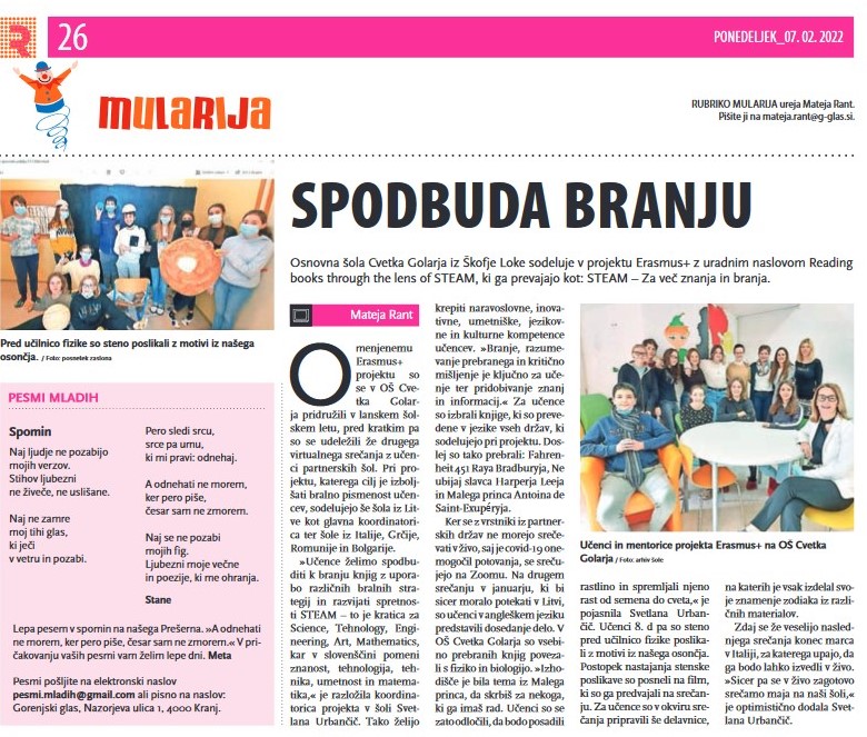 O projektu Erasmus+ so pisali tudi v rubriki Mularija v Gorenjskem glasu, ki je izšel v ponedeljek, 7. februarja 2022.Povezava tukaj.
