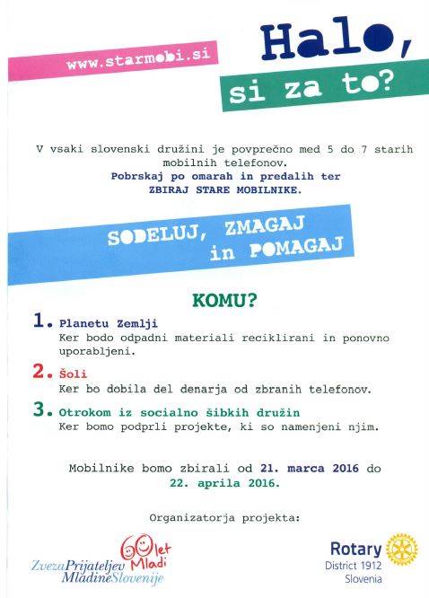 Zveza prijateljev mladine Slovenije in Rotary klubi Slovenije so pripravili prav posebno akcijo, v kateri bomo po slovenskih vrtcih, osnovnih in srednjih šolah zbirali stare mobilne telefone. Zakaj telefone? Ker v sebi skrivajo pomembne surovine, ki so dragocene in jih težko pridobivamo. Odkupujejo jih podjetja, ki lahko te surovine ponovno uporabijo.